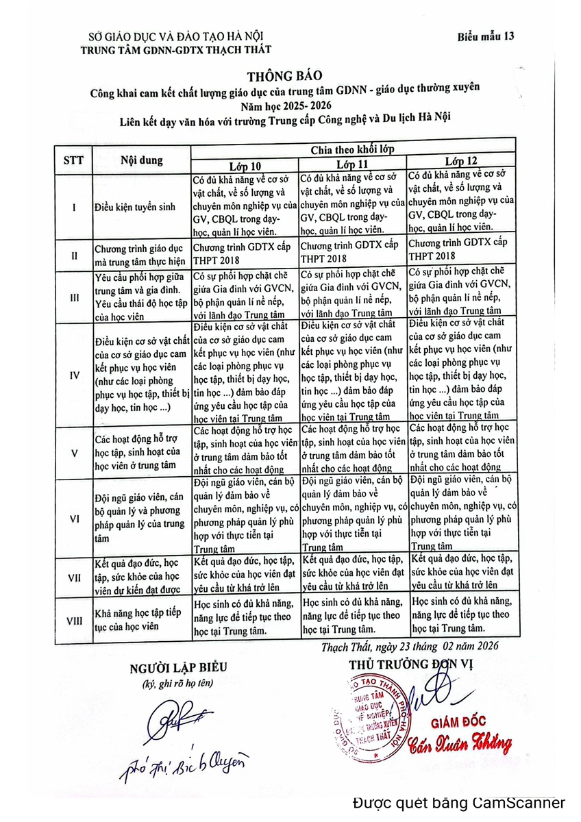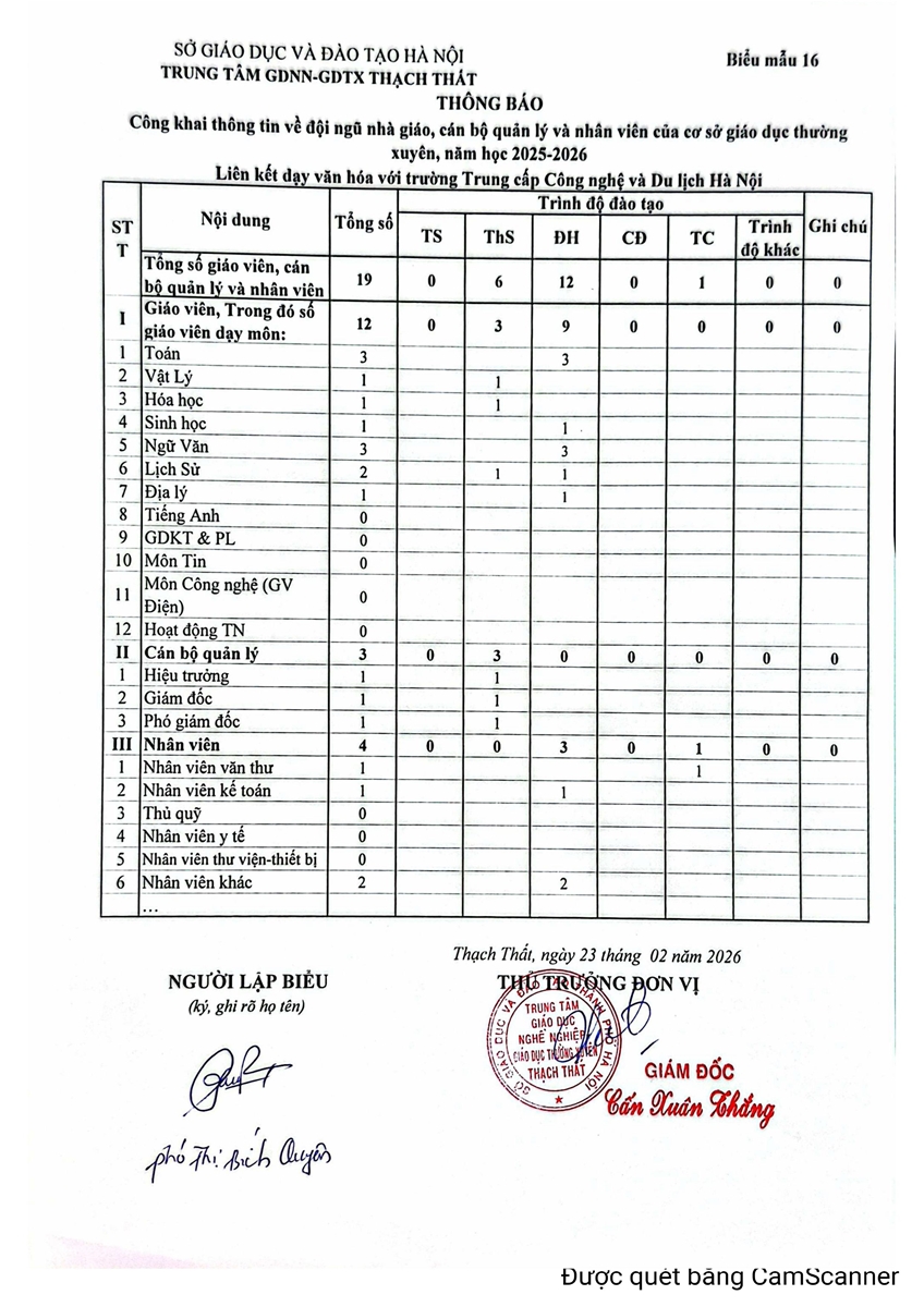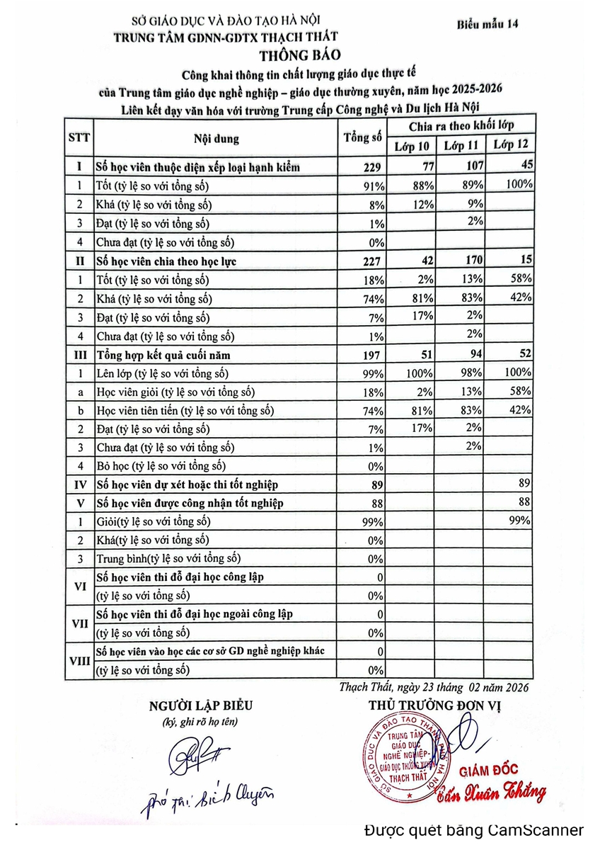 Công khai thông tin chất lượng giáo dục Trung tâm GDDN- GDTX Thạch Thất năm học 2025-2026