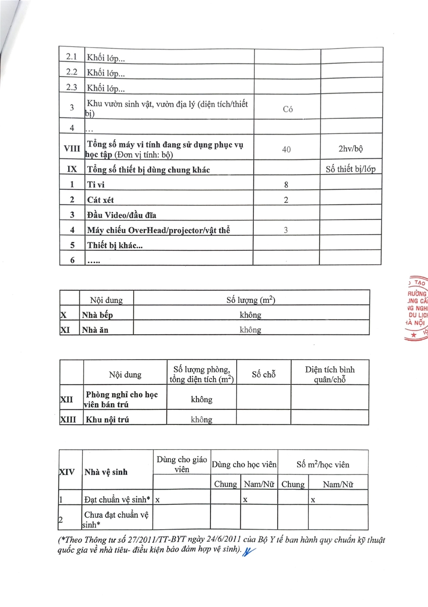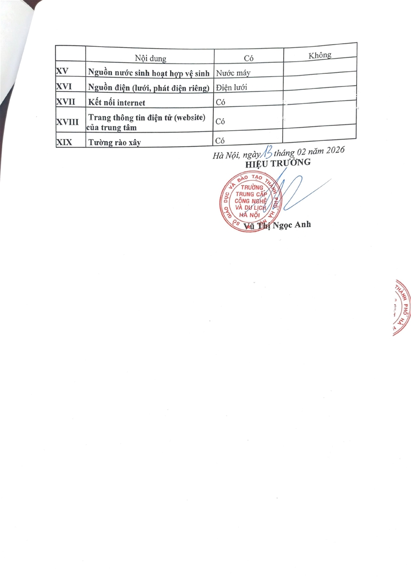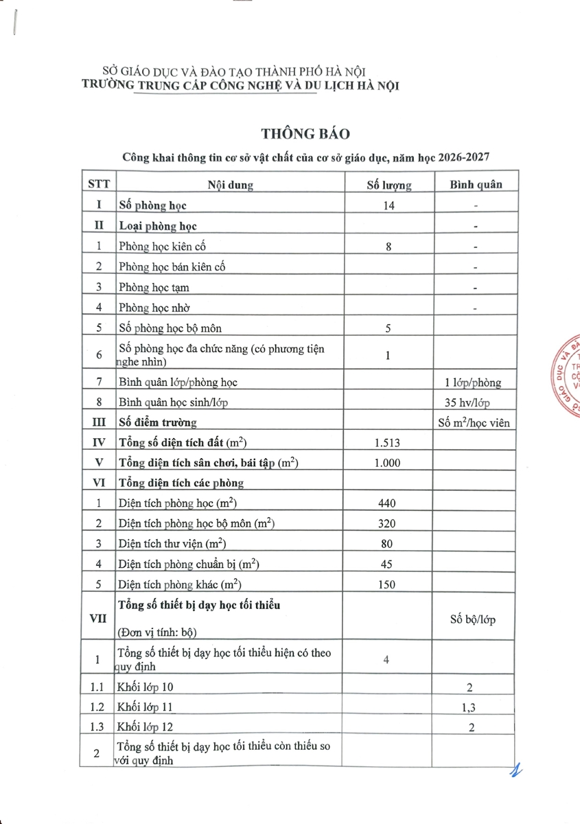 Trường Trung cấp Công nghệ và Du lịch Hà Nội công khai thông tin cơ sở vật chất của cơ sở giáo dục năm học 2026-2027 như sau: